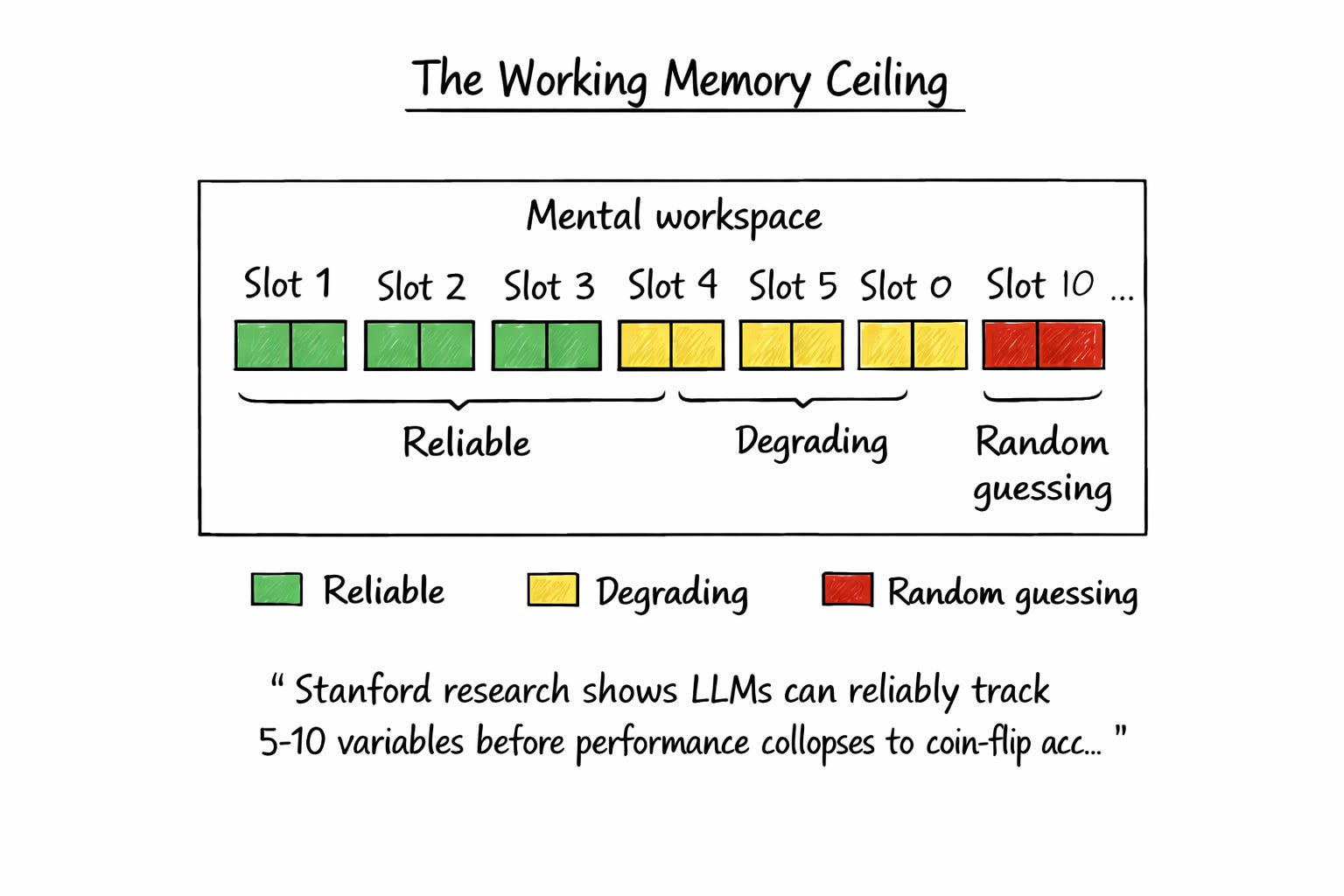 Apple’s research revealed something counterintuitive: when problems become very difficult, models actually expend less reasoning effort. Their internal heuristics signal diminishing returns, so they give up rather than trying harder. Stanford researchers found similar limits on working memory. LLMs can track at most 5-10 variables before performance degrades toward random guessing.