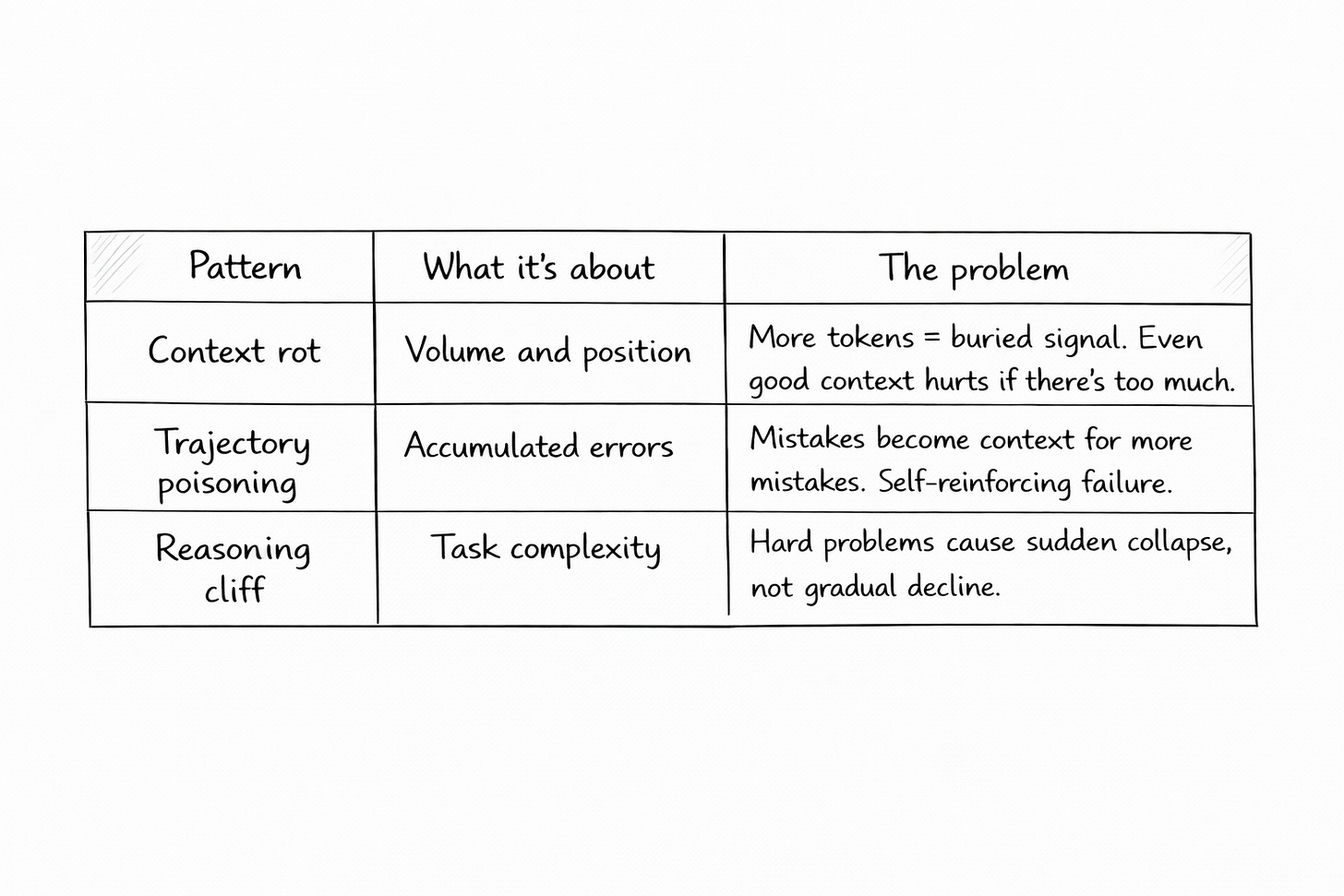 The first is context rot. This is about volume and position, not task difficulty. As you add more tokens to the context window, the model’s ability to find and use relevant information degrades. The culprit is attention: every token competes with every other token. Add 10,000 tokens of background code, and the 500 tokens that actually matter get harder to locate.