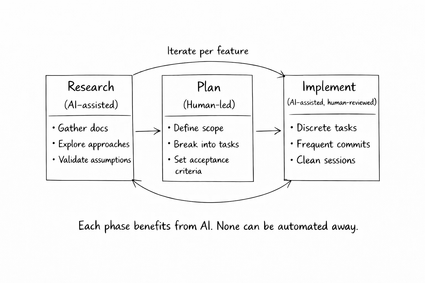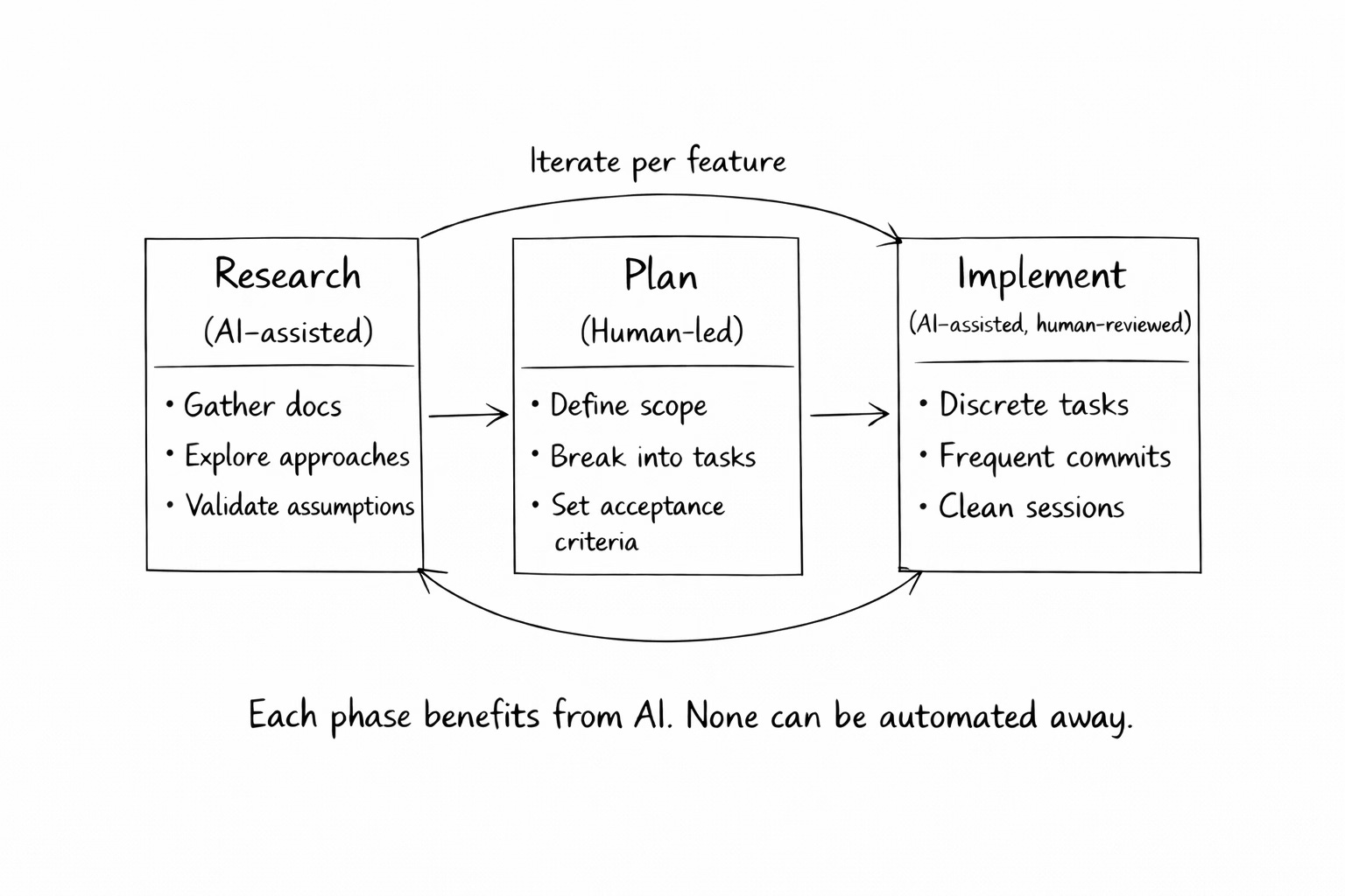 Adherence to a structured SDLC that was optional in a pre-AI world becomes essential when your implementation partner takes instructions literally and forgets everything between sessions. Processes like Spec-Driven Development or Research Plan Implementation (RPI) are tailored for working with coding agents. Each phase benefits from AI assistance.
