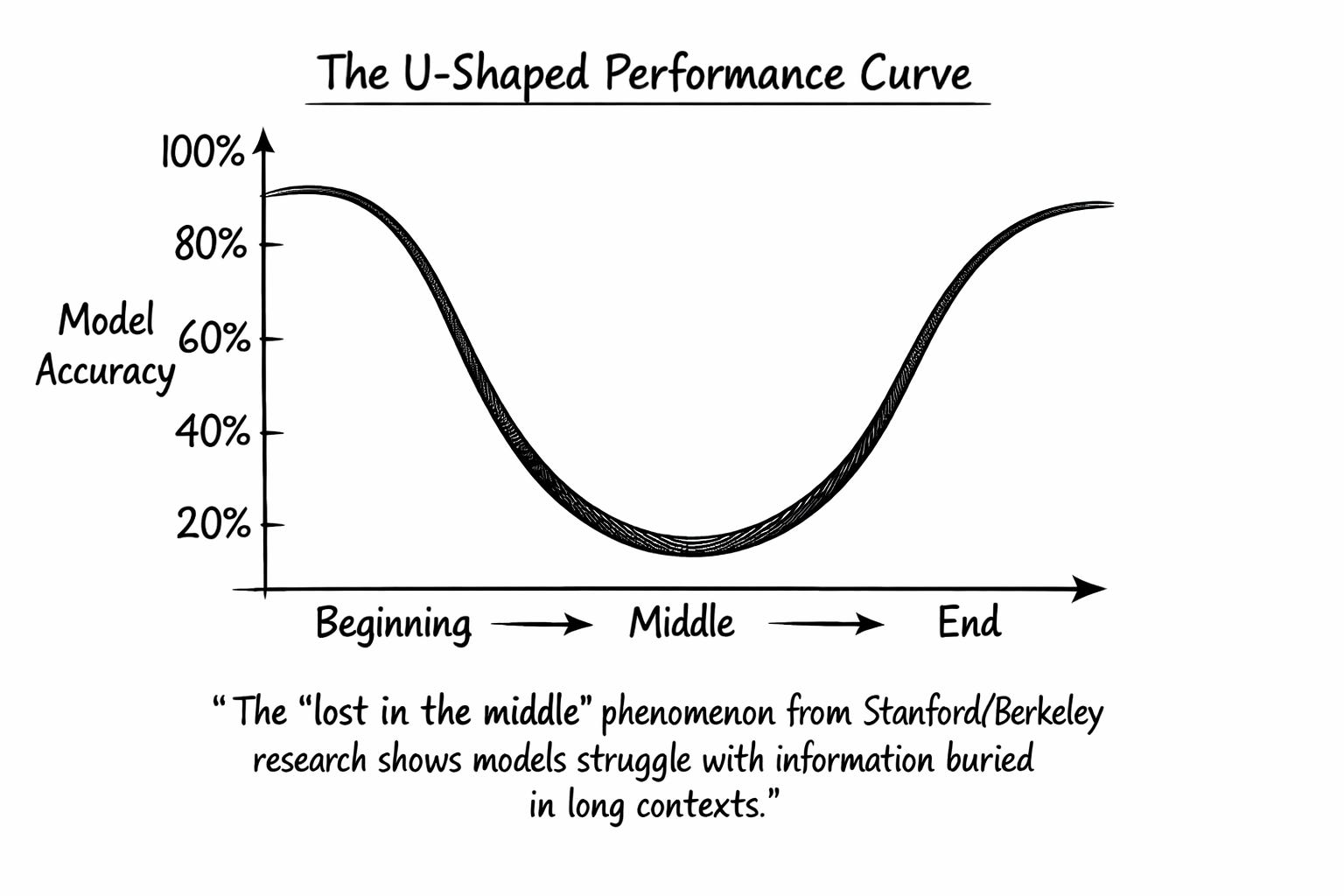 Research from Stanford and Berkeley identified what they call the lost-in-the-middle phenomenon: LLMs perform best when relevant information sits at the beginning or end of the input context, with significant degradation when models must access information buried in the middle. Performance follows a U-shaped curve, favoring primacy and recency while struggling with everything between.