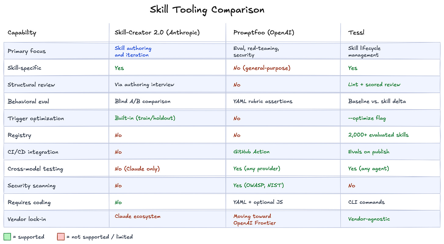 These tools aren’t competing. They’re complementary, and together they represent the market converging on a single idea: skills need quality infrastructure. Anthropic built it into the authoring experience. OpenAI acquired it for the security layer. Tessl built the vendor-agnostic lifecycle platform.